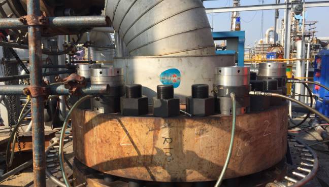 液壓扳手重量輕,扭矩大,使用方便,有中空液壓扳手和驅(qū)動(dòng)液壓扳手兩種類型,兩種互補(bǔ)基本覆蓋大部分工況,螺栓形態(tài)對(duì)其限制不大,方案可調(diào)整空間大,使用范圍廣。螺栓拉伸器呢,雖然種類也不少,因是同心拉伸擰緊所以精度更高,體積小型號(hào)也更多,但同時(shí)也有螺栓上部空間限制,露頭要求,并且螺母也必須要有撥孔才能用。從方案適用廣度上來(lái)說不如液壓扳手,但在同步鎖緊方面液壓扳手最多只能做到四同步,而螺栓拉伸器可以做到100%覆蓋,也就是說如果同步鎖緊,工具充足,螺栓拉伸器則可更高效。