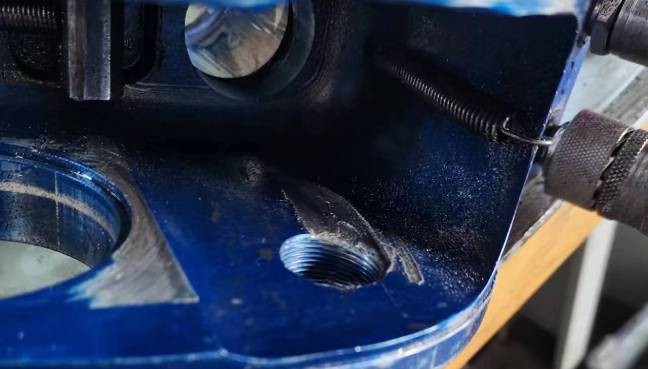 我們拆解檢查發(fā)現(xiàn),改扳手的兩側(cè)驅(qū)動板在同一位置發(fā)生斷裂,油缸外沿刮擦缺損嚴(yán)重,殼體內(nèi)腔出現(xiàn)嚴(yán)重刮削凹痕,整個扳手內(nèi)部充滿金屬碎屑。從各部位損傷跡象我們可以推導(dǎo)出最先出現(xiàn)問題的應(yīng)該是驅(qū)動板。長期高負(fù)荷運(yùn)行或者使用過程中的受力不均導(dǎo)致液壓扳手驅(qū)動板出現(xiàn)損傷,但彼時(shí)并沒有達(dá)到非常嚴(yán)重的斷裂,扳手有些微卡但依然能夠轉(zhuǎn)動使用,導(dǎo)致操作人員沒有及時(shí)發(fā)現(xiàn)和處理。但這個時(shí)候裂痕使得驅(qū)動板不再光滑,并與殼體及油缸外沿產(chǎn)生接觸和刮削嚴(yán)重?fù)p傷了油缸和殼體。同時(shí),刮擦下來的金屬碎屑又在運(yùn)動中進(jìn)入棘輪棘爪,對棘輪棘爪也造成了不小傷害。本來只用更換驅(qū)動板,卻差點(diǎn)毀了整個扳手。