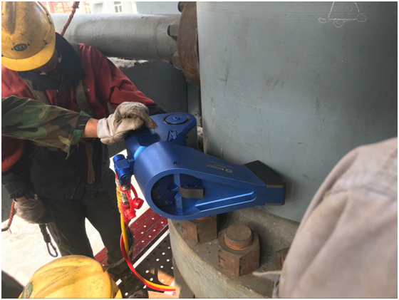 現(xiàn)場的螺栓工況比較狹隘,所定制的薄壁套筒一次吻合,使用液壓扳手一次性到位,管道試壓無泄露,為客戶節(jié)省了相當寶貴的施工時間。