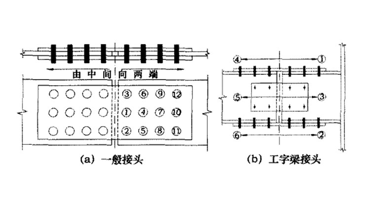 3、施擰時,應嚴格遵循先中間、后四邊,先接頭剛度大的部位后約束小的部位進行施擰。圖4為一般節(jié)點接頭及工字梁接頭螺栓施擰順序 。