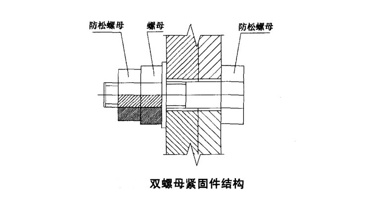 4、雙螺母連接也是目前廣泛采用的一種螺栓防松動的方法。這種鎖緊裝置的工作原理是靠兩螺母的螺紋產(chǎn)生的微小彈性變形而將螺母鎖緊,其具有更長的抗振壽命。圖 5 是一種常見 的雙螺母緊固件,由防松螺母、螺母和防松螺栓組成。其中防松螺母和螺母旋擰方向相反,防松螺栓末端 由工作螺紋和防松螺紋兩段直徑不同的螺紋組成,防松螺紋外徑小于緊固螺紋內(nèi)徑。 緊固件在工作時,螺母在振動、沖擊等作用下,可能發(fā)生微小變形或松動,但由于兩螺母的旋擰方向相反,防松螺母此刻起到擰緊和阻止螺母松退 的鎖緊作用,從而確保工作螺母無法松脫。