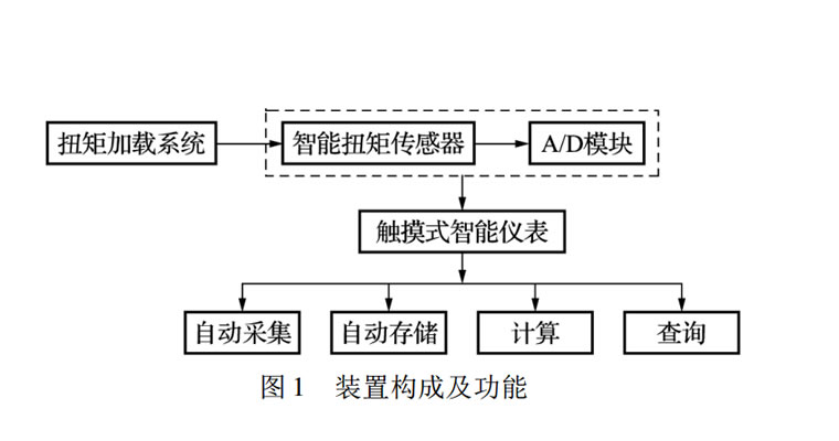 整個(gè)智能型便攜式電動(dòng)扭矩扳手校準(zhǔn)裝置由扭矩加載系統(tǒng)、智能傳感器和智能儀表等構(gòu)成, 如圖 1所示。自動(dòng)和手動(dòng)相結(jié)合的加載方式提高了工作效率,也節(jié)省了人力。智能傳感器采用低成本的 DALLAS2401 半導(dǎo)體芯片, 降低了生產(chǎn)成本, 可實(shí)現(xiàn)自動(dòng)識別功能。觸摸式智能儀表能實(shí)現(xiàn)峰值自動(dòng)采集、存儲計(jì)算和查詢功能,可在現(xiàn)場完全取代計(jì)算機(jī)。