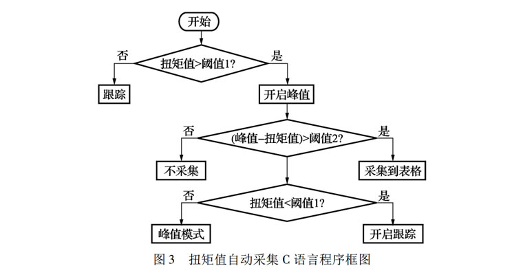 大多數(shù)儀表只具有顯示功能不具有數(shù)據(jù)采集和分析功能,校準(zhǔn)人員在校準(zhǔn)時(shí),一邊操作校準(zhǔn)裝置,一邊用筆記錄校準(zhǔn)數(shù)據(jù)。這樣不但工作效率低還容易出錯(cuò)。為了方便校準(zhǔn)員做記錄,儀表專門設(shè)計(jì)了數(shù)據(jù)采集功能,采集表格形式完全按照 JGJ707—2014《扭矩扳子檢定規(guī)程》的表格形式[7,這樣方便后面的計(jì)算和出證書。儀表采用具有C語言功能的觸摸屏作為顯示終端。校準(zhǔn)人員可以通過設(shè)定最大扭矩值和采集觸發(fā)值, 實(shí)現(xiàn)扭矩值的自動(dòng)采集。并根據(jù)采集數(shù)據(jù)進(jìn)行平均值和示值相對誤差和示值重復(fù)性的計(jì)算。C 語言程[8]框圖如圖3 所示。其中閾值1表示進(jìn)入峰值模式的判斷條件,閾值2表示采集峰值判斷條件。當(dāng)扭矩值超過閾值 1,儀表自動(dòng)從跟蹤模式變?yōu)榉逯的J健.?dāng)峰值和當(dāng)前的扭矩值之差大于閾值 2 時(shí),程序會將峰值自動(dòng)采集到表格中,然后解除峰值功能。閾值1和2的設(shè)定根據(jù)智能傳感器的量程來計(jì)算得到。本設(shè)備中閾值1為傳感器滿量程值的5%,閾值2為滿量程值的2/3。