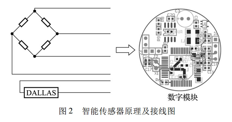 將模擬應(yīng)變式傳感器經(jīng)過組橋后直接將電橋的電壓模擬信號接入單片機(jī) CS5530 的模擬輸入端,通過 CS5530的A/D 轉(zhuǎn)換器將電壓信號轉(zhuǎn)換成數(shù)字信號, 單片機(jī)對時(shí)鐘電路、復(fù)位電路、電源電路、串行通訊模塊、存儲模塊進(jìn)行控制,通過編程處理后按照一定的格式將數(shù)據(jù)通過 RS485 串行通訊接口輸出。采用DALLAS2401半導(dǎo)體芯片。該芯片在工廠生產(chǎn)時(shí),刻入經(jīng)檢測的64位注冊碼(8位家族碼+48位序列碼+8位CRC校驗(yàn)碼),因此可以保證沒有任何兩個(gè)器件的注冊碼是相同的。采用低成本 TSOC 表面貼封裝,方便裝在傳感器插頭或接線腔中。原理圖如圖2所示。