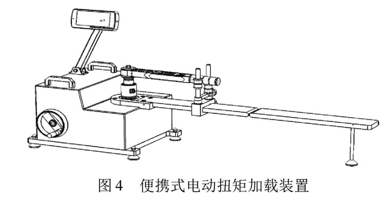 為方便現(xiàn)場檢定使用,整個(gè)設(shè)備必須方便攜帶。因此檢定裝置的支撐臂采用可折疊式,扭矩傳感器也采用直插式,現(xiàn)場不需任何工具就可以安裝和拆卸加載裝置。智能儀表采用可伸縮支架固定,方便調(diào)整角度。整個(gè)裝置的結(jié)構(gòu)示意圖如圖 4 所示。因?yàn)榇蟛糠值默F(xiàn)場裝置考慮到電源的問題, 所以多是采用手動(dòng)加載的方式。這樣在被檢扳手從剛裝上到加上扭矩會有一段空行程, 全部采用手動(dòng)加載,一方面比較費(fèi)力,另一方面工作效率也不高。因此,在加載方式上采用手動(dòng)和電動(dòng)相結(jié)合的方式,裝置中加一個(gè)儲能式電機(jī)來實(shí)現(xiàn)空行程的電動(dòng)加載,節(jié)省人力,提高效率, 當(dāng)空行程結(jié)束傳感器加上力后就可以改成手動(dòng)加載。